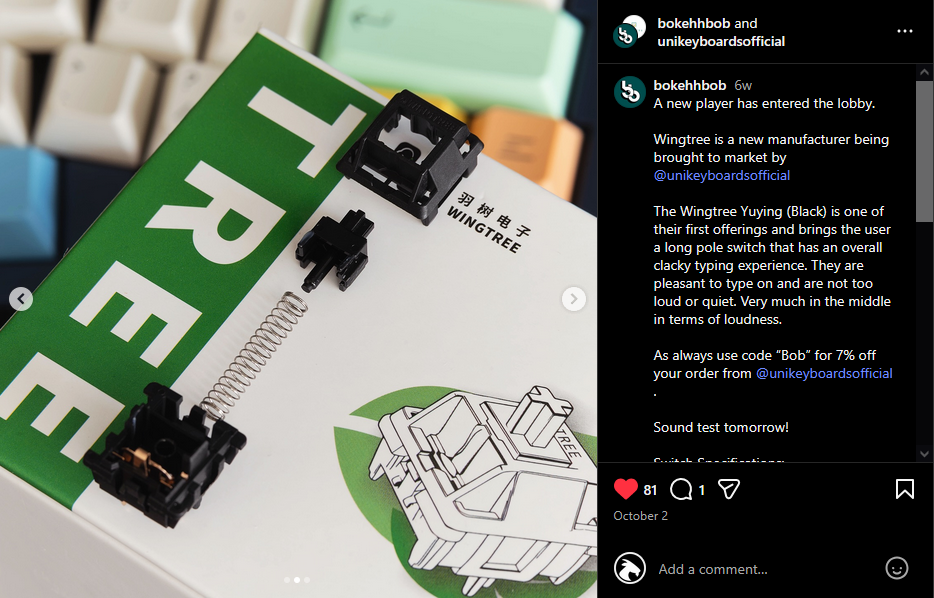 Figure 10: Collaborative post between Unikeys and content creator bokehbob showing off both Wingtree-made switches as well as their distinctive packaging.
